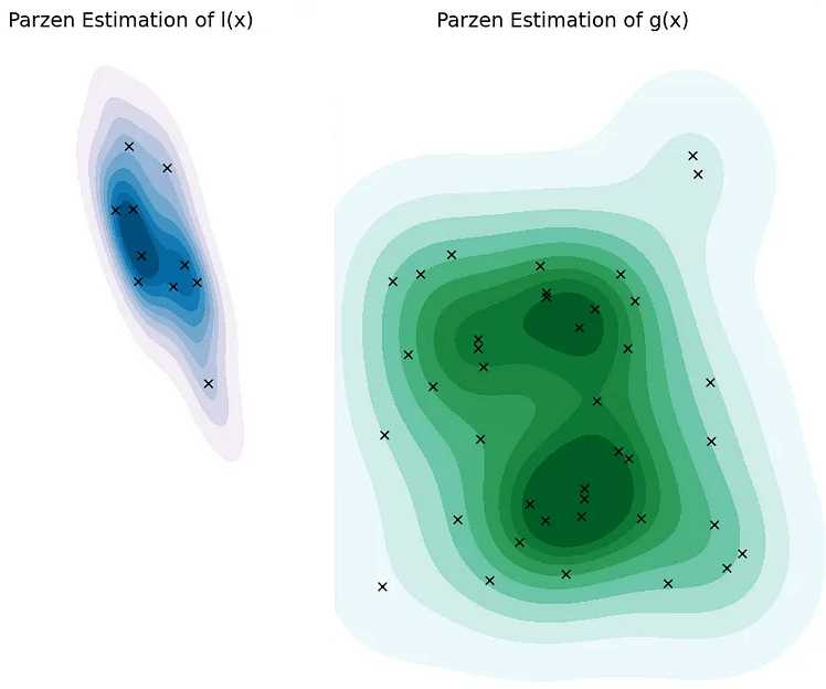 The Parzen window estimator is a statistical model for density estimation, which is also called the kernel density estimator (KDE). In the TPE algorithm, Parzen window estimators are used to estimate the densities of good hyperparameters \(l(x)\) and bad hyperparameters \(g(x)\).