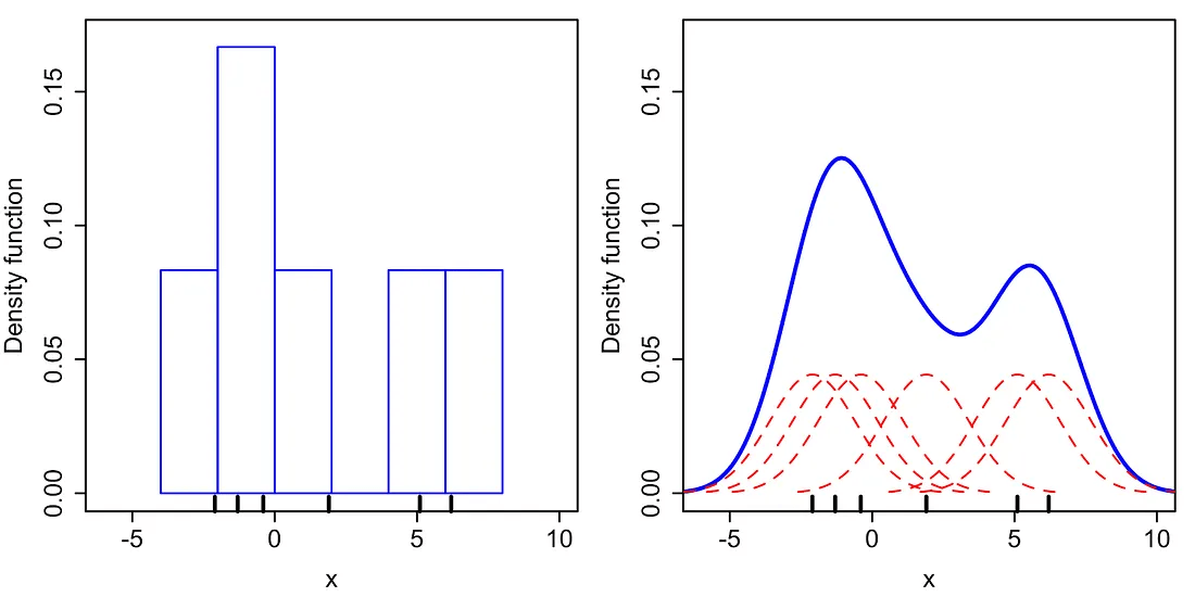 Intuitively speaking, the Parzen window estimator (in right figure) is a smoothed version of the histogram of relative frequency (in the left figure).